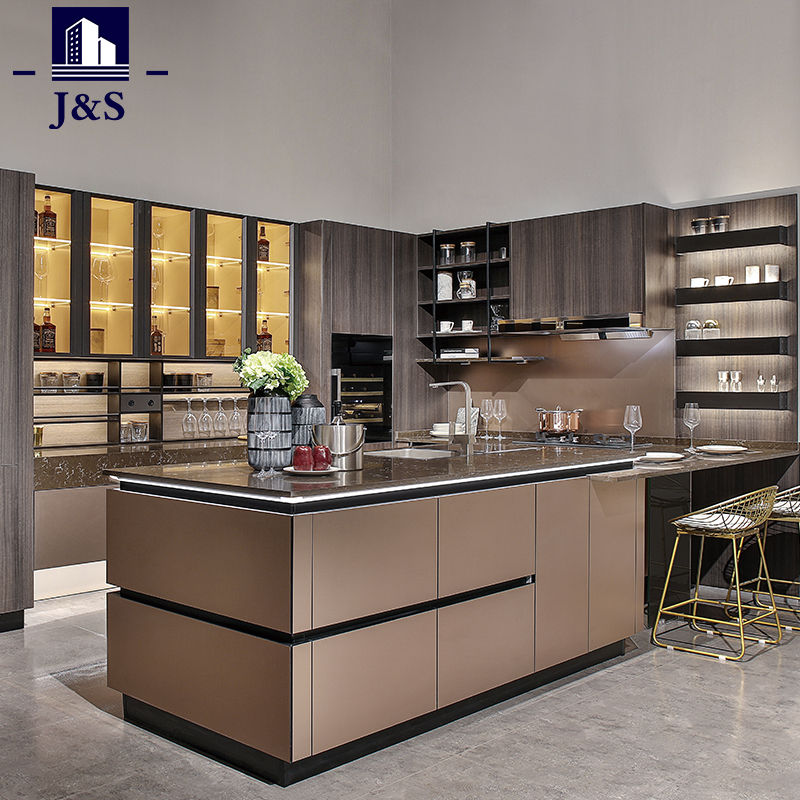 जे एंड एस मटेइरल मटेइरल आउट डोर किचन बिल्ट इन किचन डिजाइन की आपूर्ति करता है। मैटेलिक शैंपेन पेंट किचन डिजाइन, हाई एंड लैकर टिम्बर ग्लास अपर किचन।