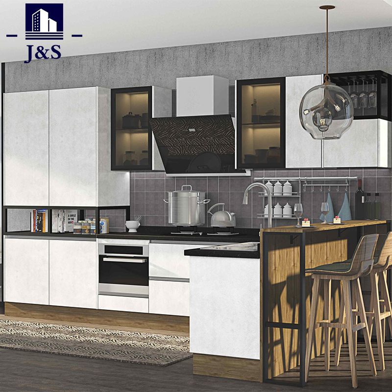 जे एंड एस आपूर्ति संवर्धन लक्जरी देशी रसोई डिजाइन सर्वोत्तम मूल्य। पीईटी कंक्रीट रंग रसोई दरवाजा, स्टेनलेस स्टील टिकाऊ बेंच टॉप।